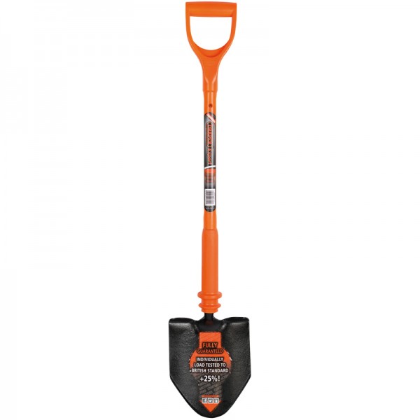 Expert Quality, fully insulated utility shovel designed for working on or near live cable and wires. Individually tested to 10,000 volts, guaranteeing safe working on 1,000V and complying to the BS 8020: 2011 standards. Manufactured with an epoxy fibreglass core and attached to a fully enclosed insulated shaft with hand slip guard. Each shovel is supplied with a certificate of conformity, which correlates with a unique traceability number embossed on the shaft. Sold loose.