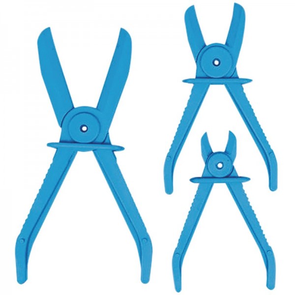 This flexible hose clamp set includes three clamps: 155mm, 185mm and 255mm. Each one is operated using a simple one-handed locking mechanism. All are made from non-conductive lightweight but strong composite material, carefully crafted from nylon and fibreglass. The jaws are set at 90-degrees for clamping in reduced access and preventing clamp creep. The set includes the following maximum jaw capacities: 17, 20, 31mm. Each clamp is a high visibility colour to help ensure the tool gets noticed and is not left attached to the vehicle. The set is suitable for use on most flexible rubber hoses including coolant, brakes, fuel, and vacuum hoses.