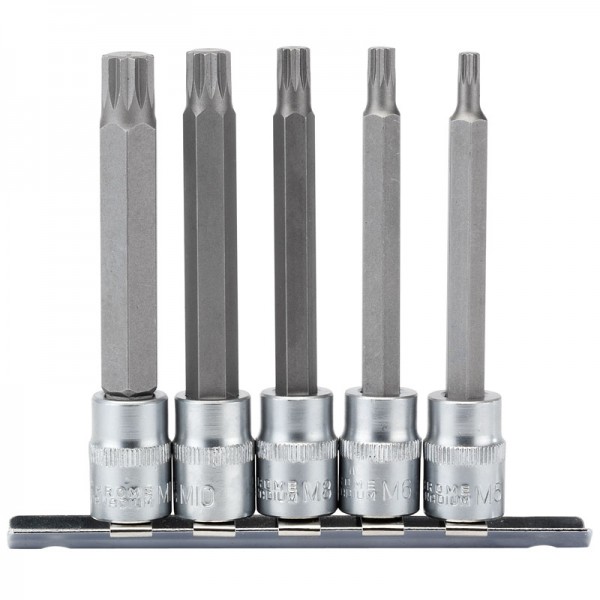 Expert Quality, 5 spline socket bits, 100mm long. All socket manufactured from hardened and tempered chrome vanadium steel with sand blasted bits of S2 silicon steel. Each socket has a knurled ring for extra grip. Supplied on a steel socket retaining rail.