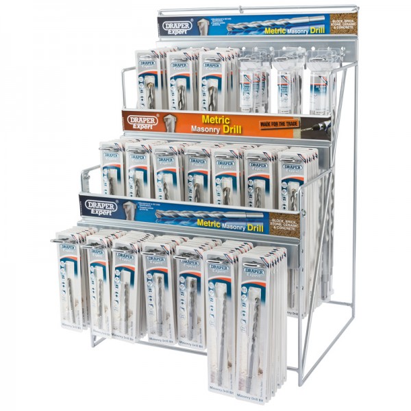 Expert quality, toolbar merchandiser for 137-piece set of assorted metric masonry drill bits for use on block, brick, stone, ceramic and concrete. Supplied with stock and toolbar header. Pegs (Stock No.23056) available for order to complete your display.