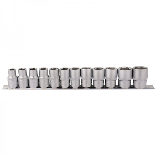 Manufactured from chrome vanadium steel, hardened and tempered with a satin finish. Each socket has a knurled ring for extra grip. Supplied on a metal socket rail for secure storage.