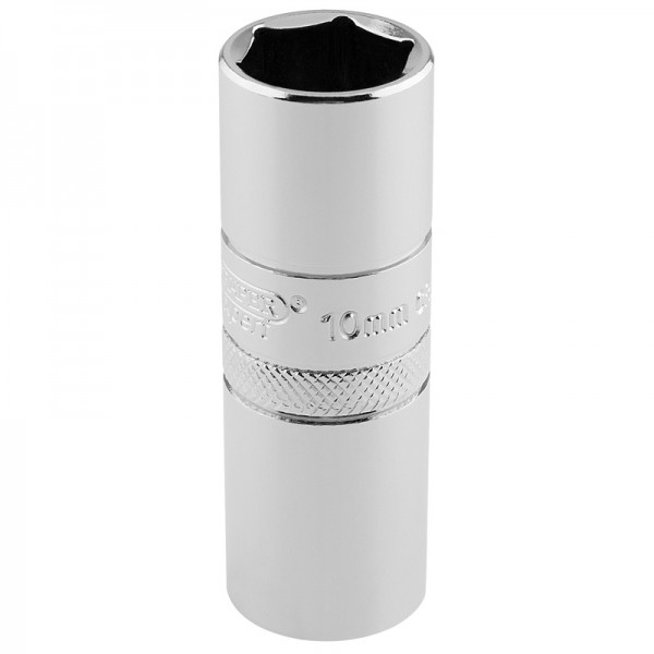 Expert Quality, 6 point deep socket with a rubber insert for plug protection and retention. Manufactured from chrome vanadium steel hardened and tempered with a polished finish. Socket length 65mm. Each socket has a knurled ring for extra grip.
