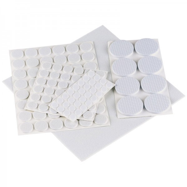 EVA pads with adhesive backing for protecting furniture surfaces, worktops, parquet and laminate flooring etc. Five sizes available. Display packed.