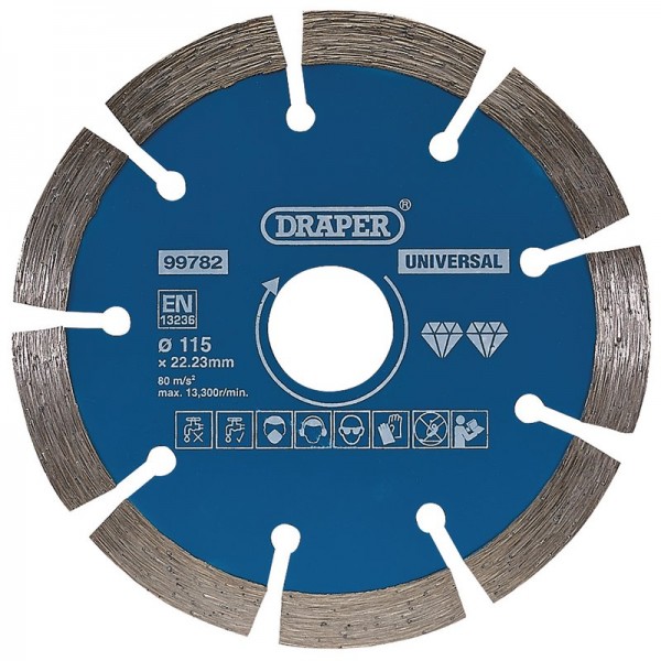 Hardened and tempered diamond blade with segmented rim for a faster cut. General purpose blade for use on concrete, bricks, stone, granite and marble. Suitable for dry and wet cutting, with optimum results when used wet. Compatible with most angle grinders with a 22.23mm bore.